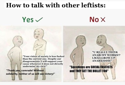 In any case, this is an argument over the validity of a method, which is not what the meme is about. The meme isn’t saying “Don’t argue with other leftists when your positions clash!”, it’s saying "Remember that there is broad room for cooperation and allyship, and that a different kind of leftist is not automatically your enemy just because they have different end-goals."