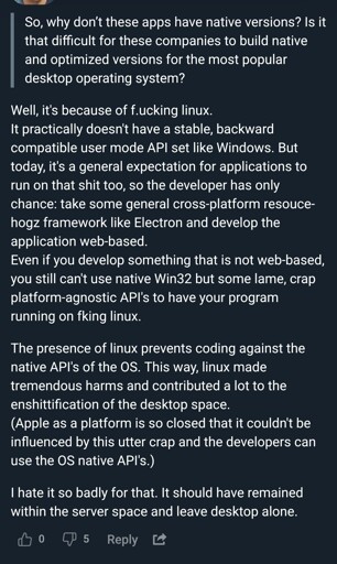 Probably “Native Linux apps are made in Linux-only bullshit by useless neckbeards, and probably only run in the terminal. Real actual apps like Discord made by a for-profit corporation have to be made cross-platform.”