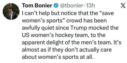 So we’ve got Trump, a member of the “protect women’s sports” movement, caught vocally deriding successful women athletes. Almost like the “protect women’s sports” movement is actually just an “exclude trans women from society” movement.