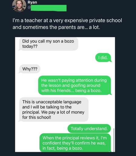 i’d wager that this parent’s gripe is not about the word “bozo” but that their child’s behavior was criticized.