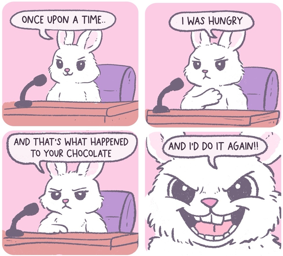 Yeah… maybe it’s that sometimes the parents forget to leave chocolate, and they say it’s (somehow) the Easter Bunny’s fault. And this comic is in reference to those excuses. That’s the best idea I’ve got.